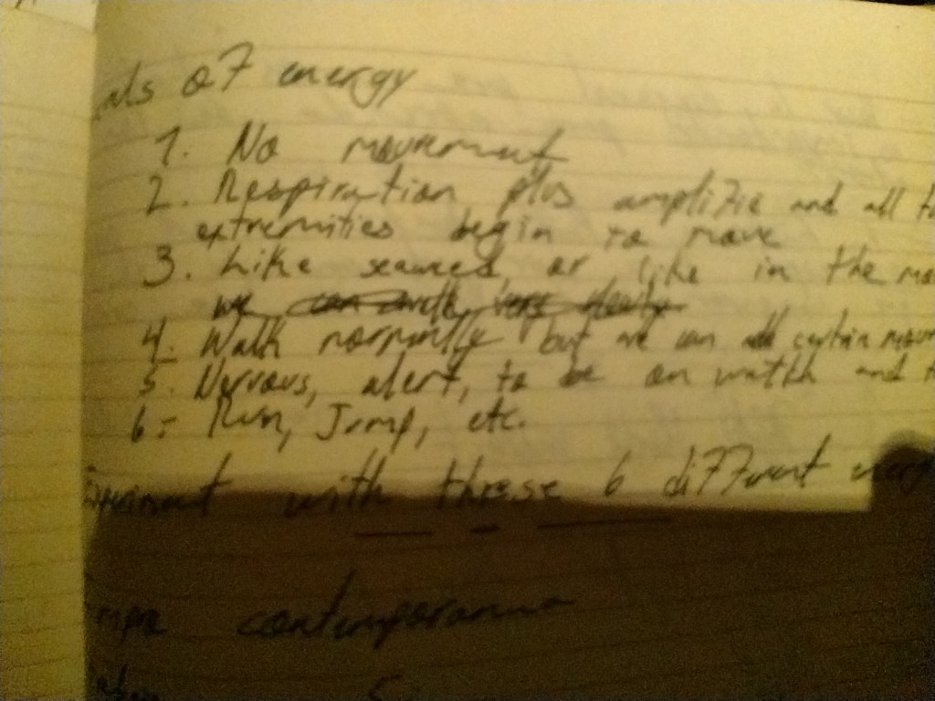 Leer cuadernos viejos es como tratar de descifrar un mensaje antiguo con poco contexto. Recién encontré los apuntes de una clase de plástica animada acerca de los 5 (6) niveles de energía. Además de que tomaba las notas en el idioma que me fuera pasando por la cabeza, franglishñol creo que sería lo más correcto!